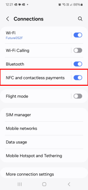 Android users - Make sure your phone is enabled to work with NFCs: Open your phone Settings, locate and open Connections, then toggle NFC and contactless payments to ON.