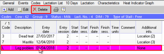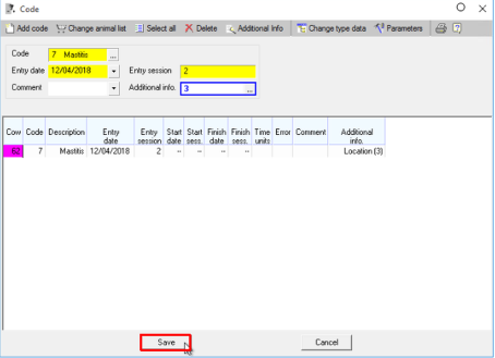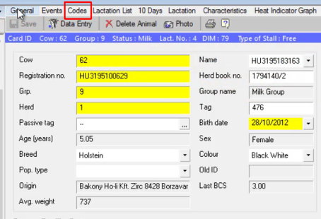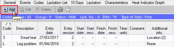 Access the codes list where you can view the list of codes already assigned to the animal, and assign a new code. You can also edit or delete an existing code.