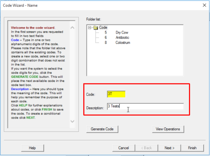 Set the code and provide a description, then click Finish.