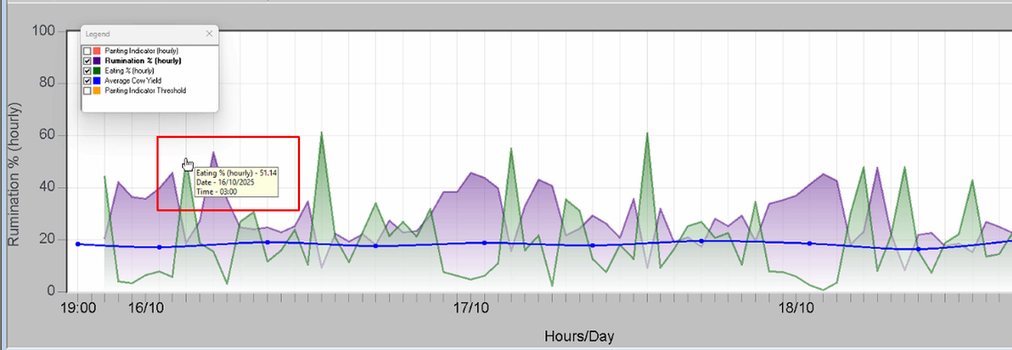 The heat stress graph provides more than just an insight into how temperatures affect group comfort. The hourly feeding and rumination patterns for the last 72 hours can be applied to monitor and improve your feeding management.